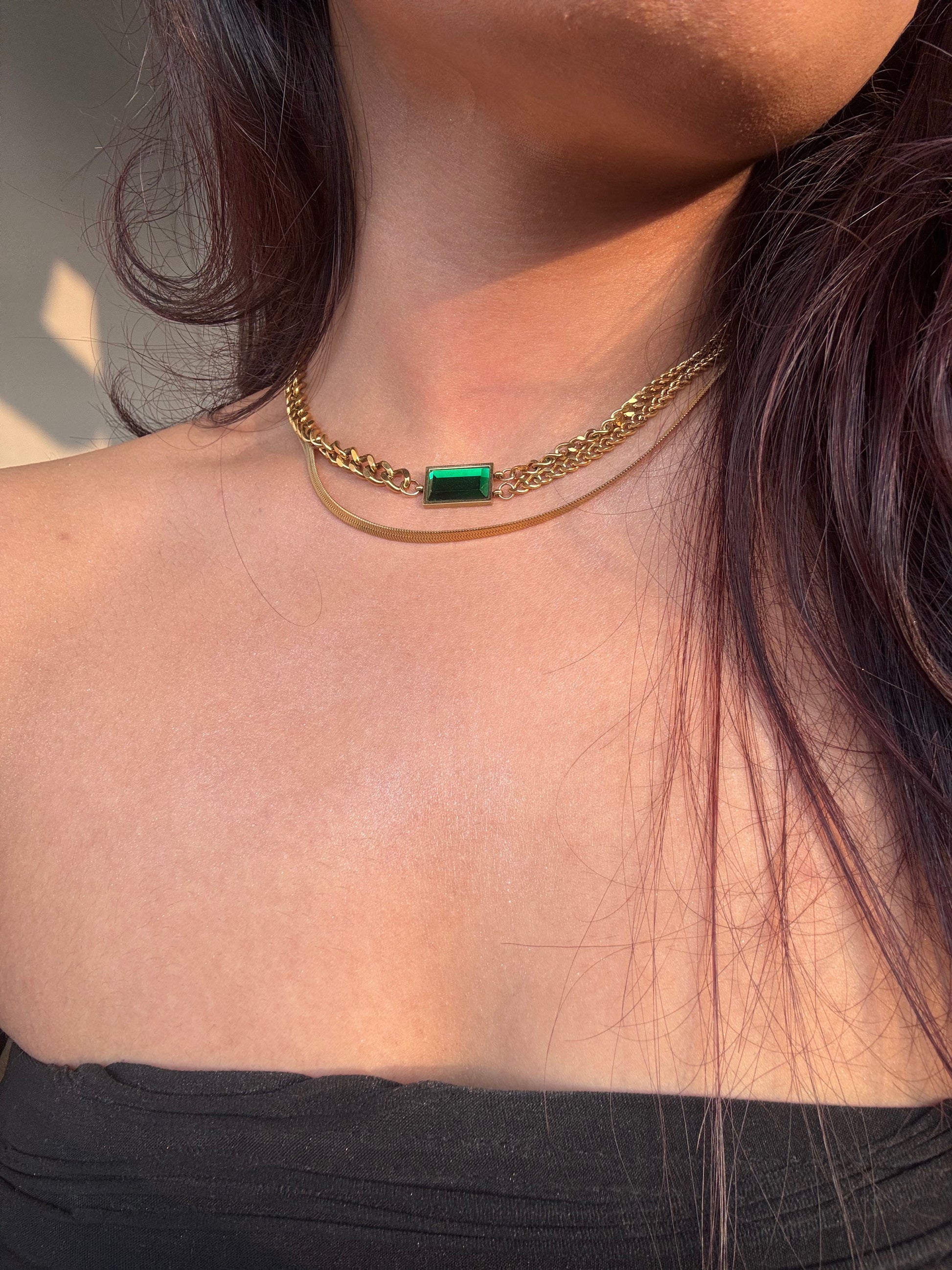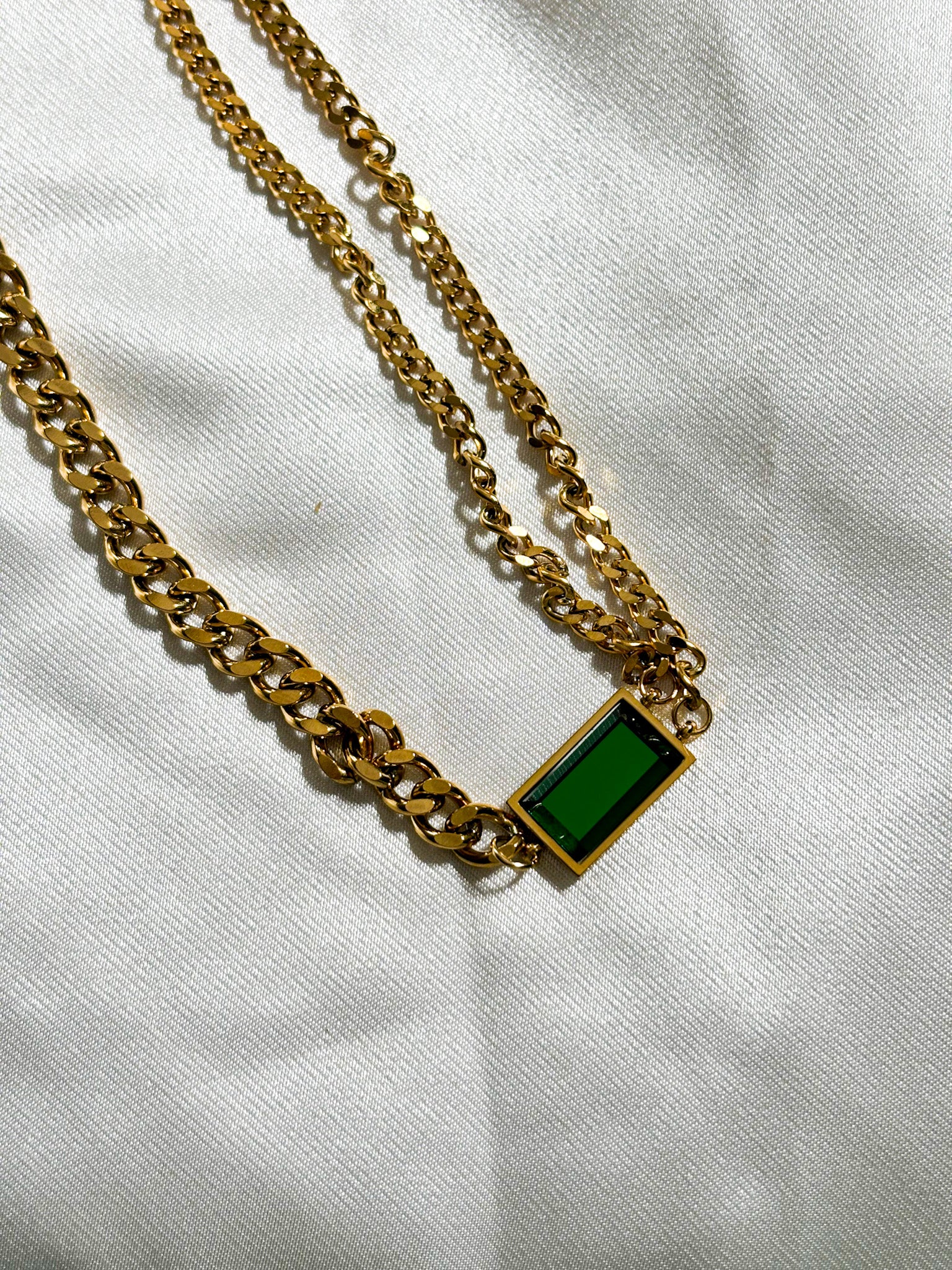 Make a bold statement with the Double Cuban Link Chain Necklace, featuring a stunning emerald at the center. This striking design showcases a single chain on one side and a double chain on the other, creating a seamless look that embodies modern street style. Ideal for the "boss babe" who wants to exude confidence and sophistication, this necklace elevates any outfit and makes a powerful impression.