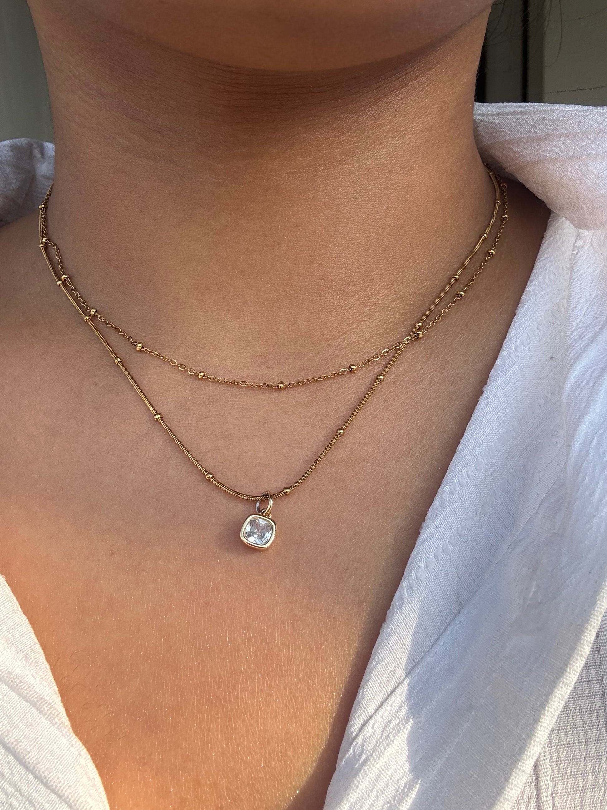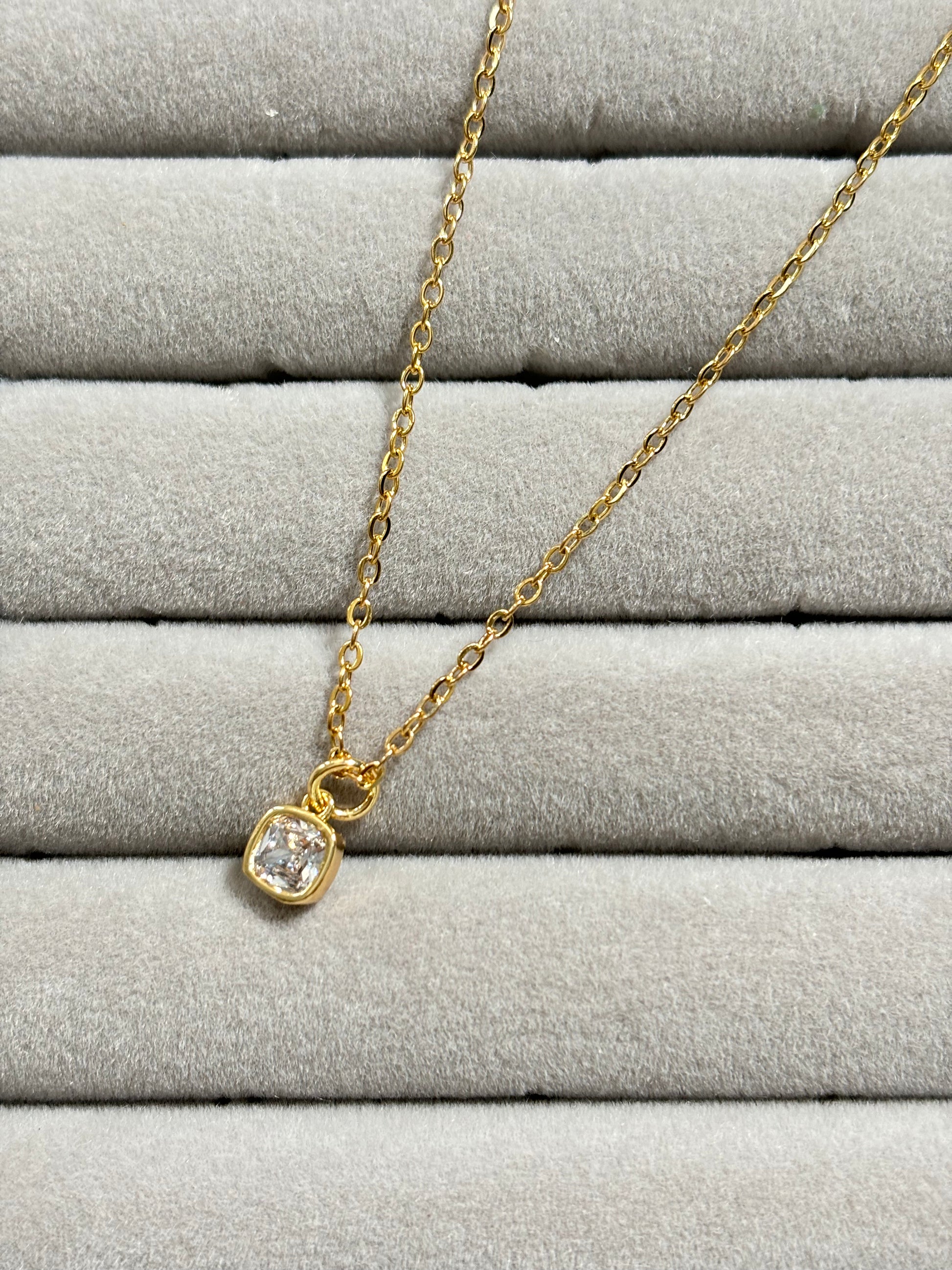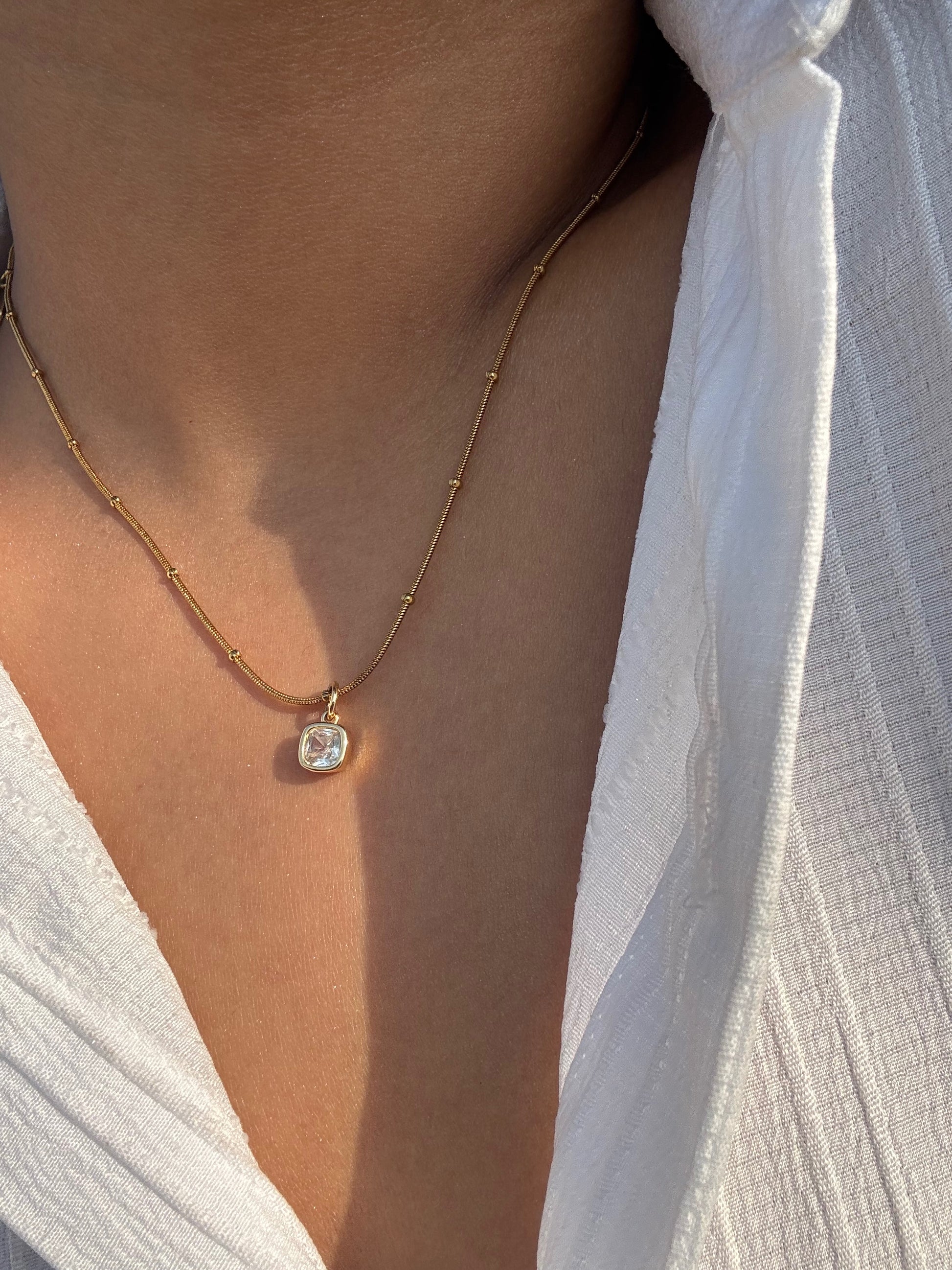 Embrace a minimalist aesthetic with the Celeste Necklace, featuring a dainty white square stone pendant. This elegant piece adds a contemporary yet understated touch to any outfit, making it perfect for daily wear and special occasions alike.