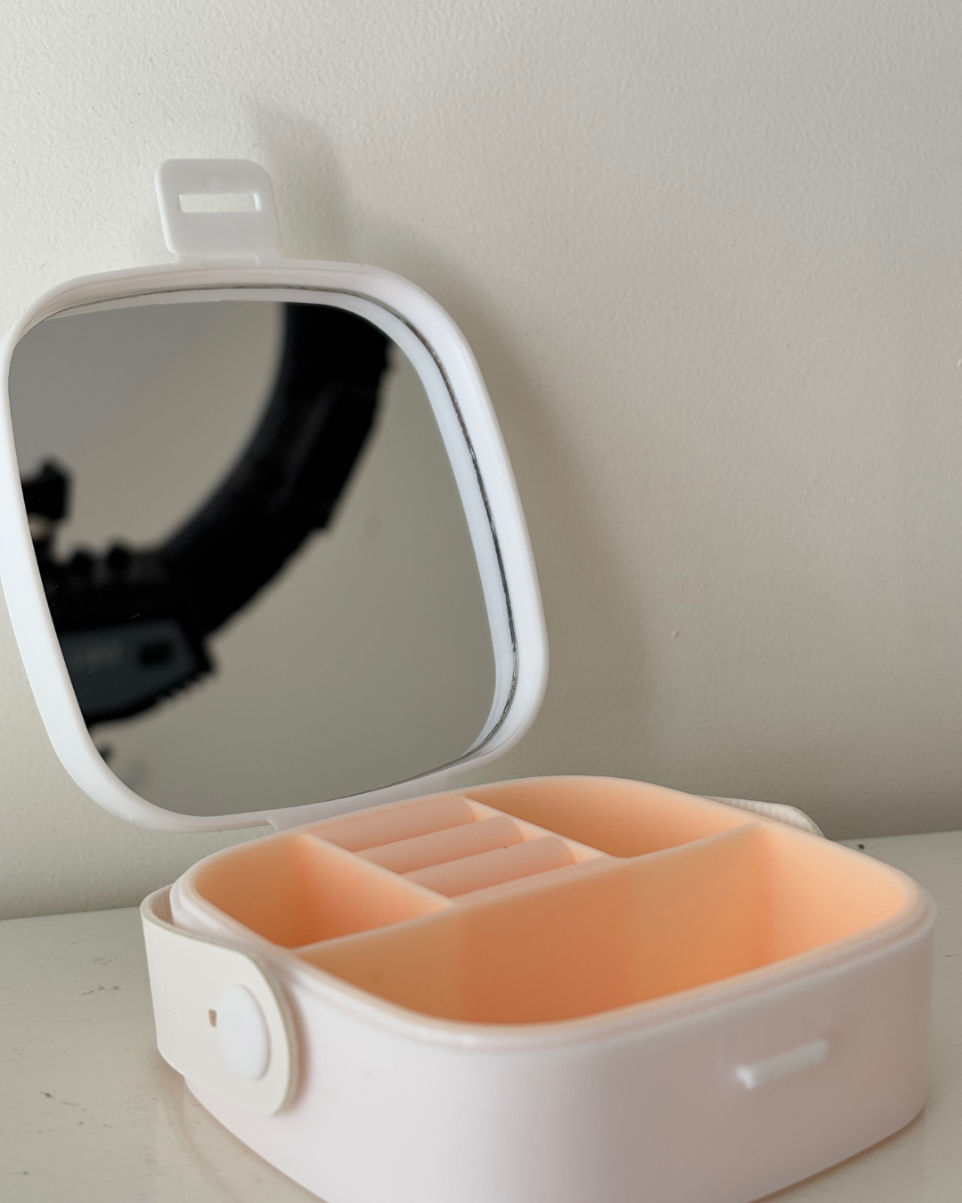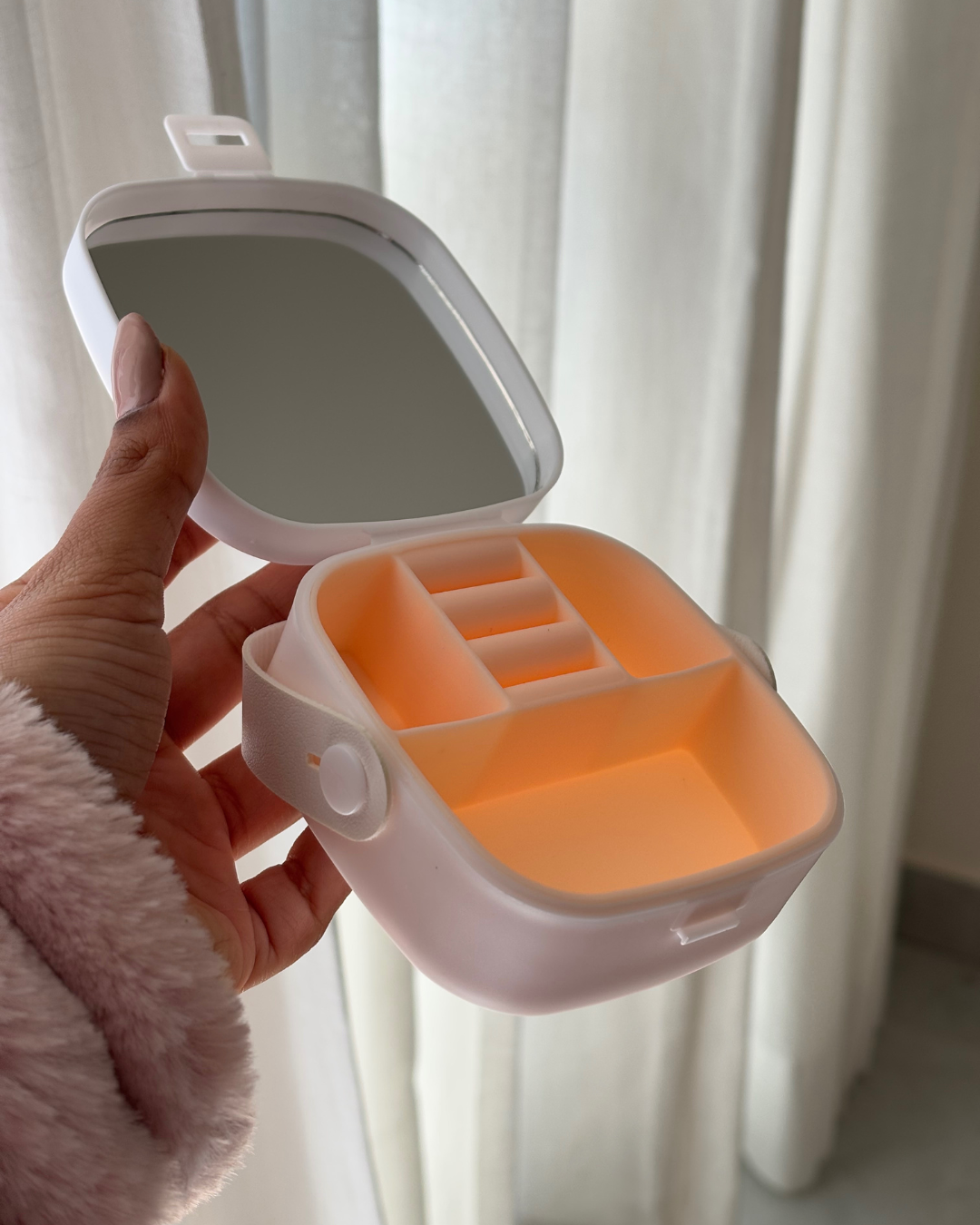 Keep your jewellery safe and stylish with this Mini Portable Jewellery Organiser. Designed for effortless storage, it features a sleek pastel off-white silicone exterior, a secure leather handle, and a built-in mirror for quick touch-ups. Compact yet spacious, it’s perfect for keeping your favourite pieces tangle-free at home or on the go.