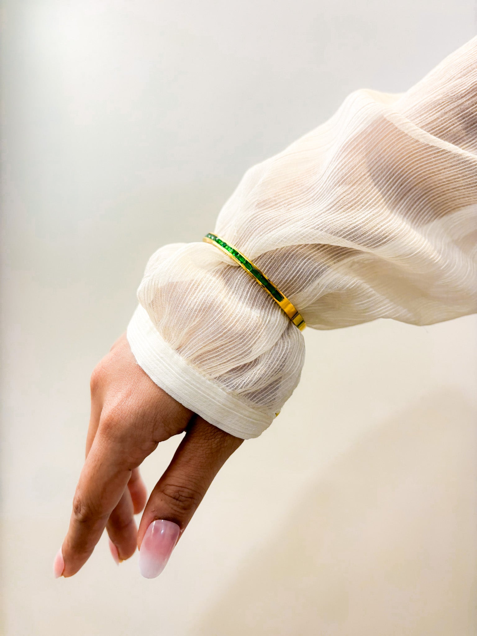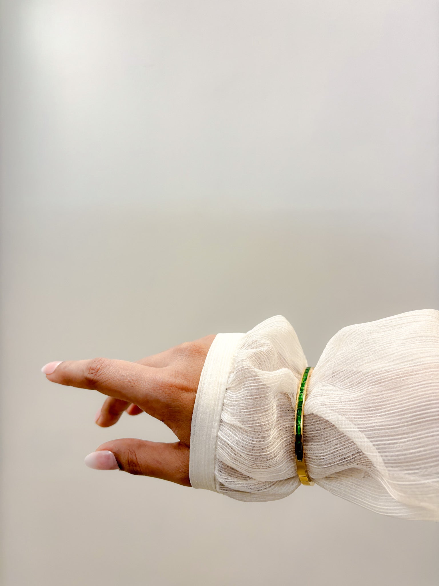 Elevate your accessory game with the Mira bracelet, a stunning golden cuff that radiates sophistication. Featuring a delicate row of vibrant green stones at its centre, this piece effortlessly transitions from day to night, making it a versatile addition to your jewellery collection.