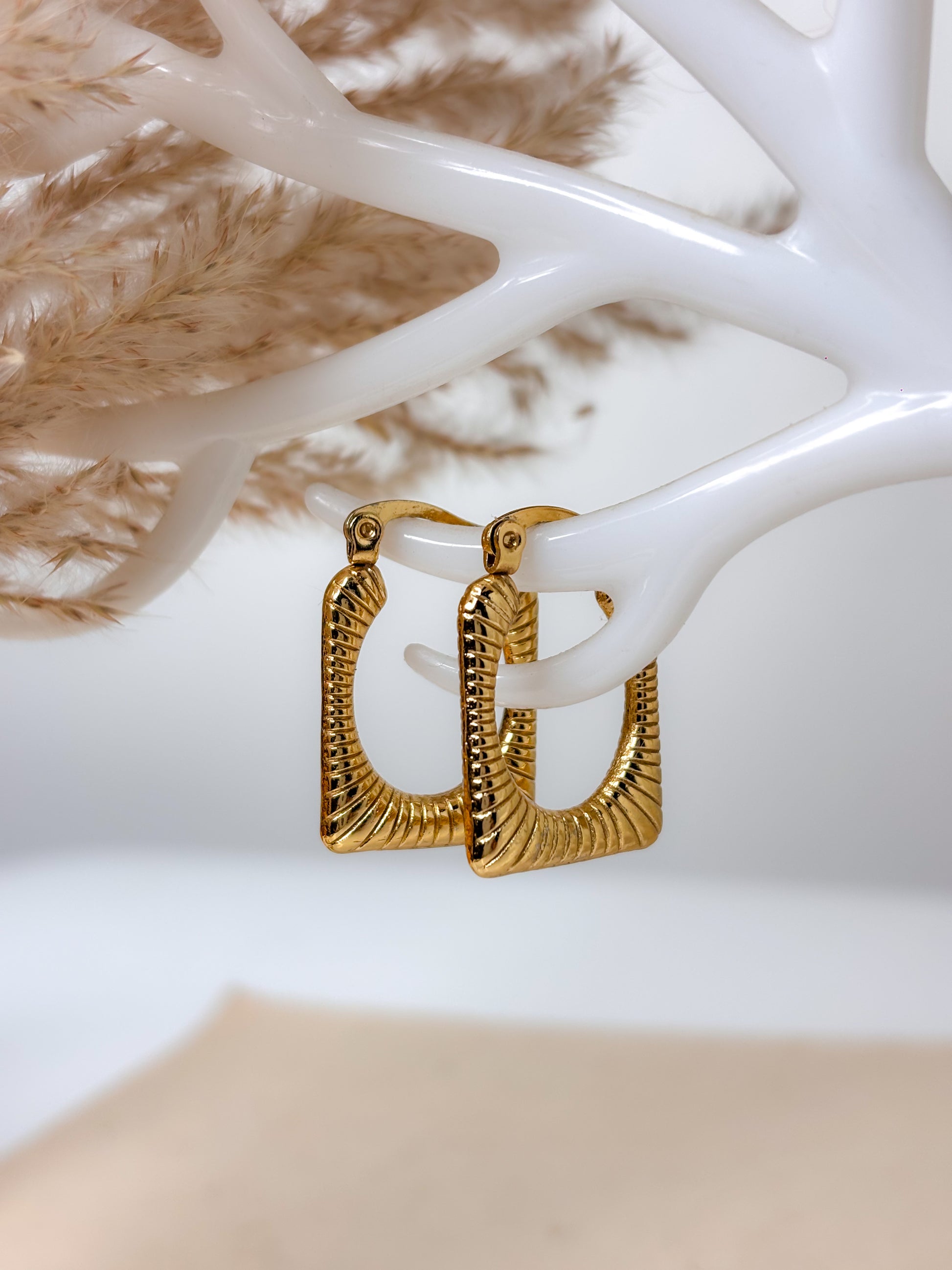 Introducing the Nova Rectangle Hoops, where sleek design meets modern style. These hoops feature a bold rectangular shape with a unique texture that catches the light beautifully. Ideal for making a statement without being overly flashy, they are a versatile accessory for any occasion.