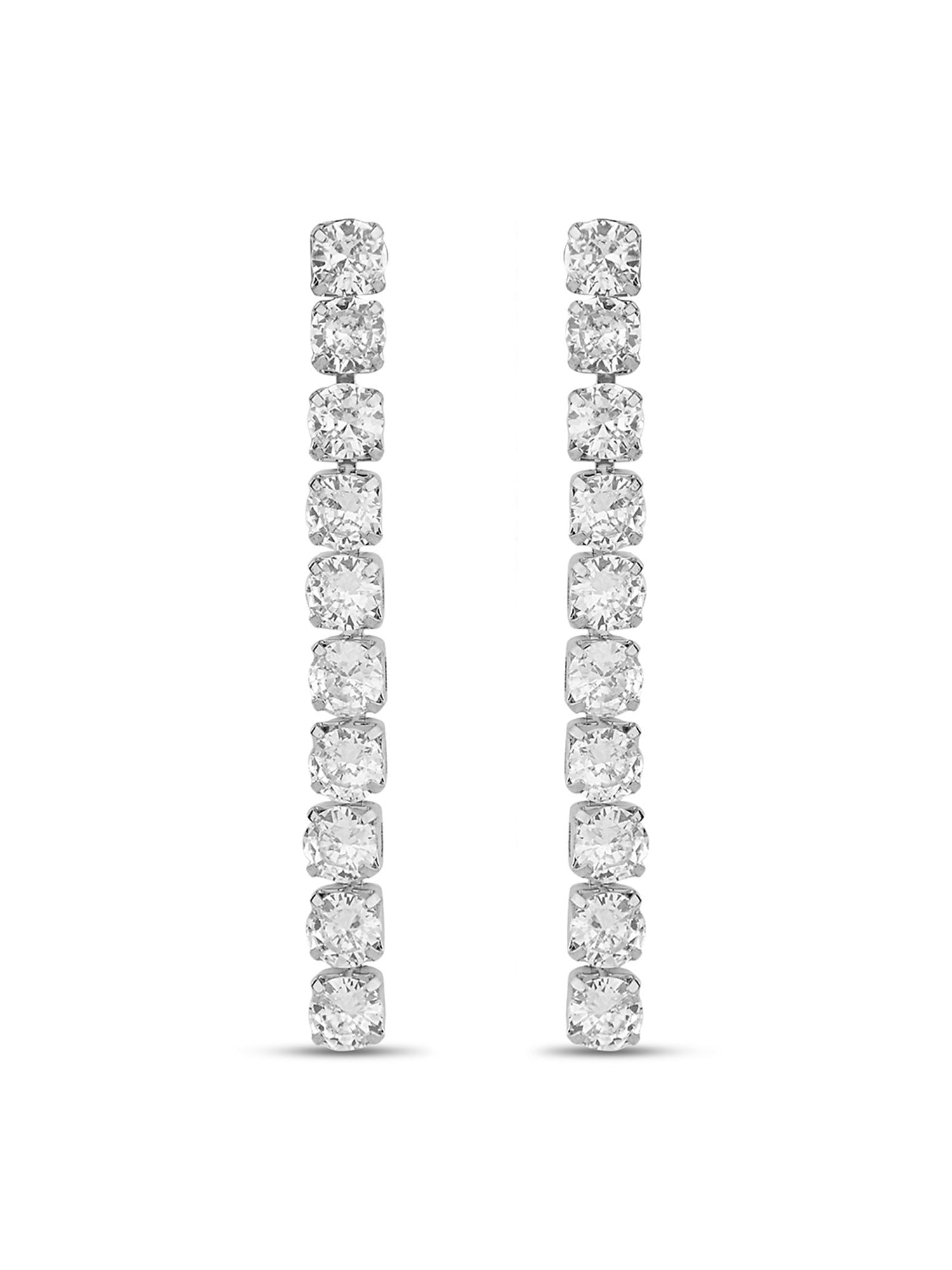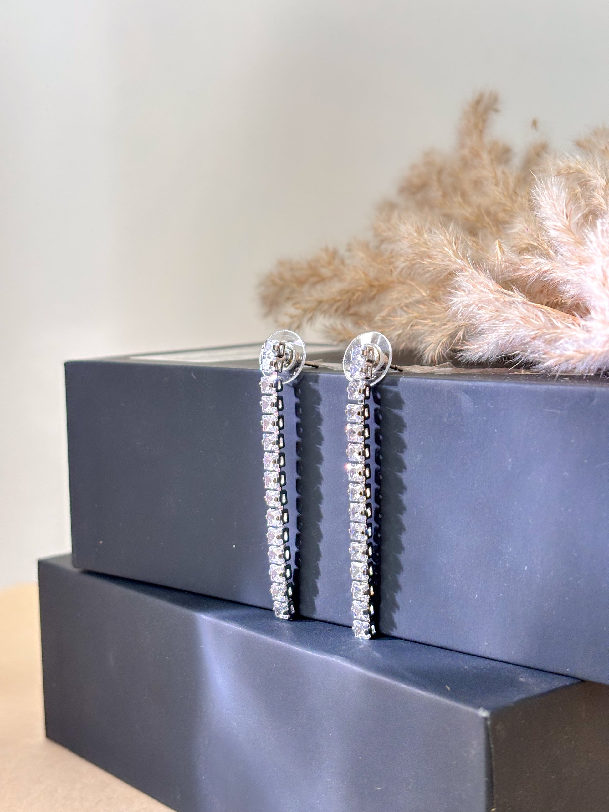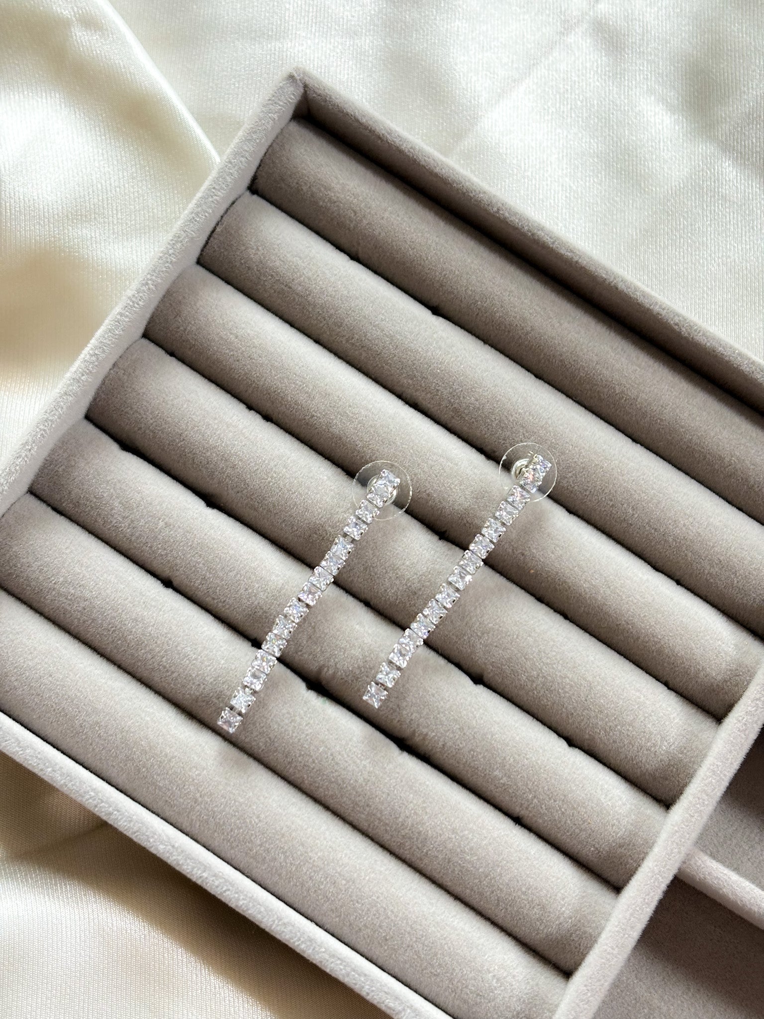 The Tennis Rhinestone Drop Earrings are a dazzling addition to any jewellery collection. Featuring a sleek string of rhinestones, these earrings offer the same classic elegance as a tennis bracelet but in a stunning earring form. Each rhinestone is delicately set to catch the light, creating a radiant effect with every movement.