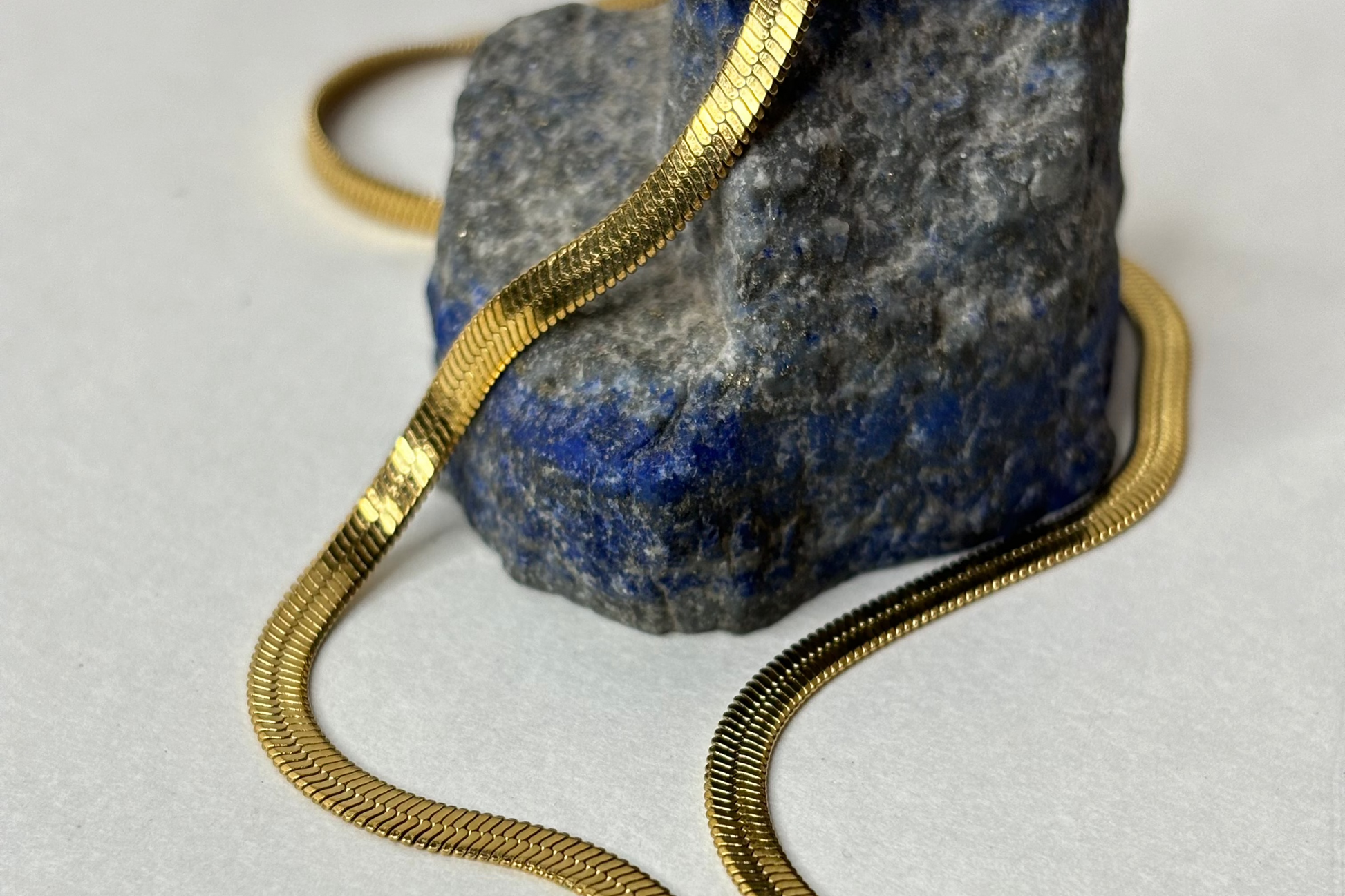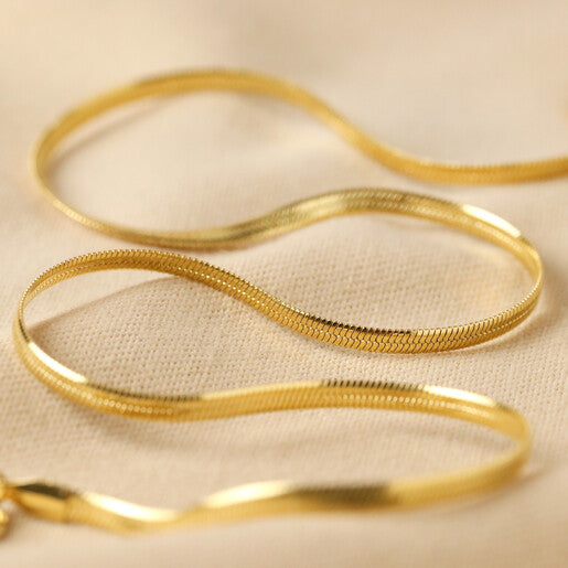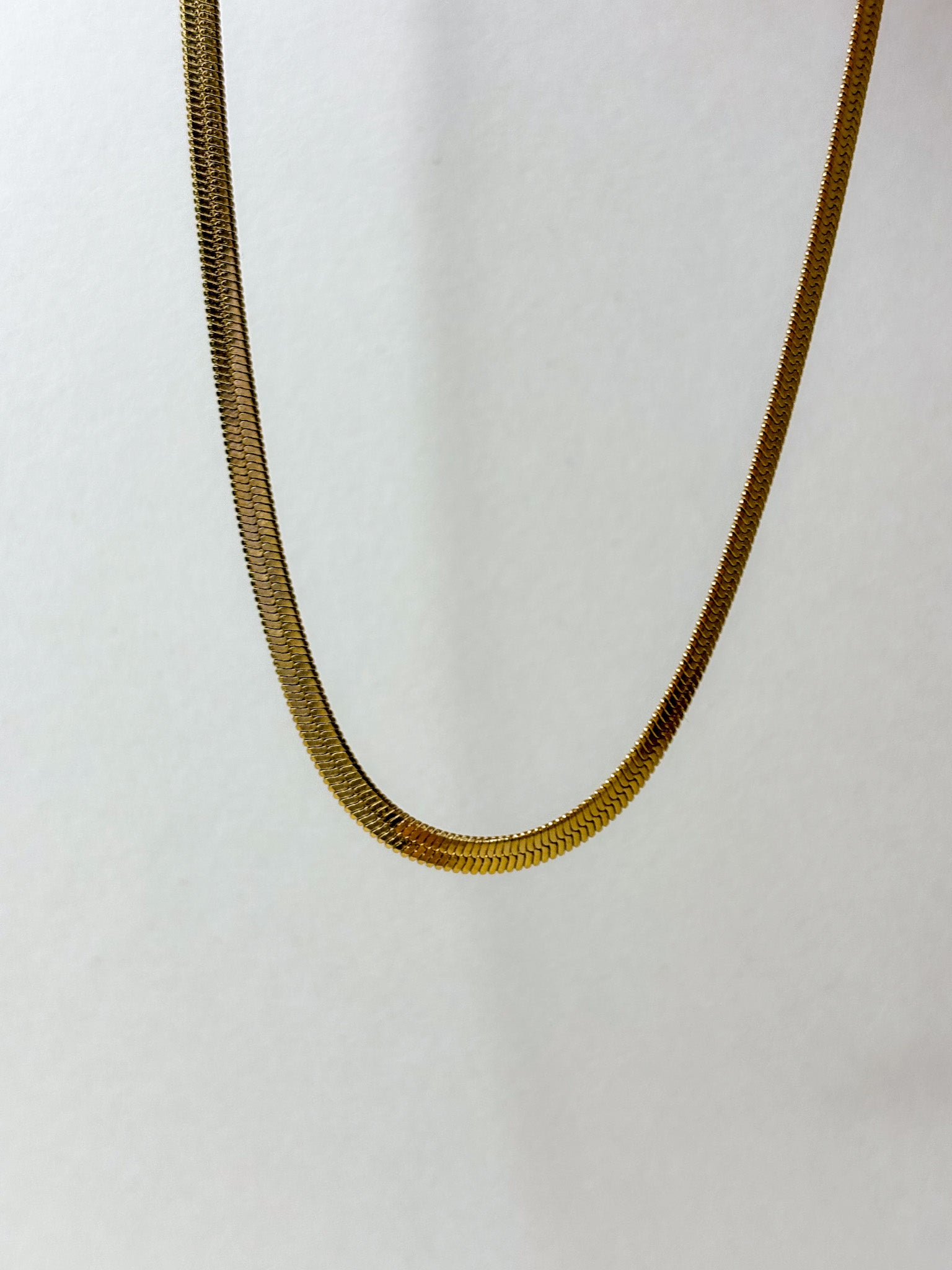 The sleek gold herringbone chain adds a delicate touch to any outfit, whether worn solo for a minimalist look or layered with your favorite pieces for a more dynamic style.